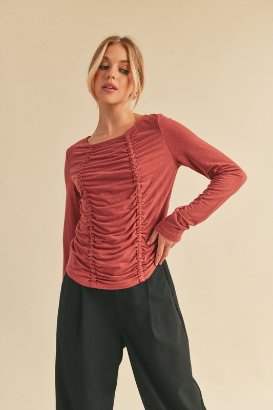Aemi+Co Ruched Front Round Neck Long Sleeve T-Shirt