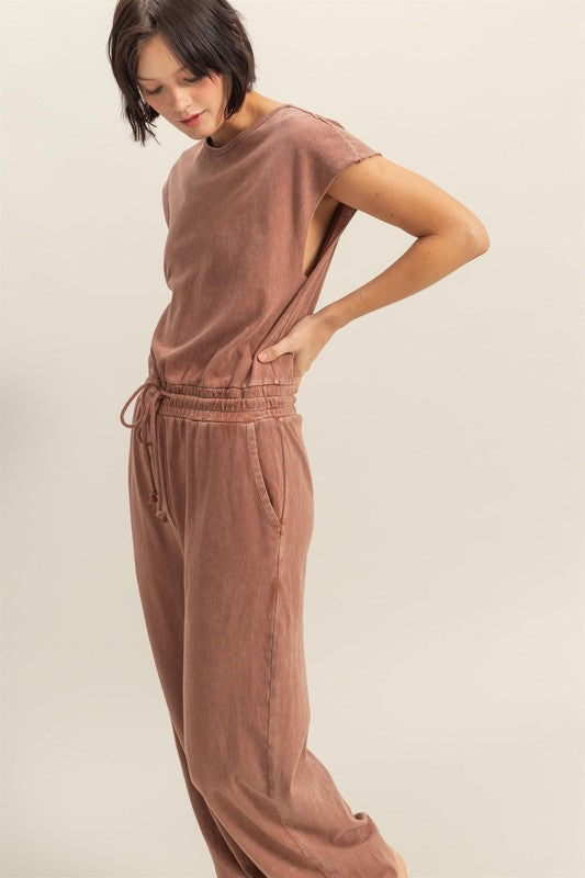 HYFVE Back Keyhole Round Neck Cap Sleeve Drawstring Jumpsuit