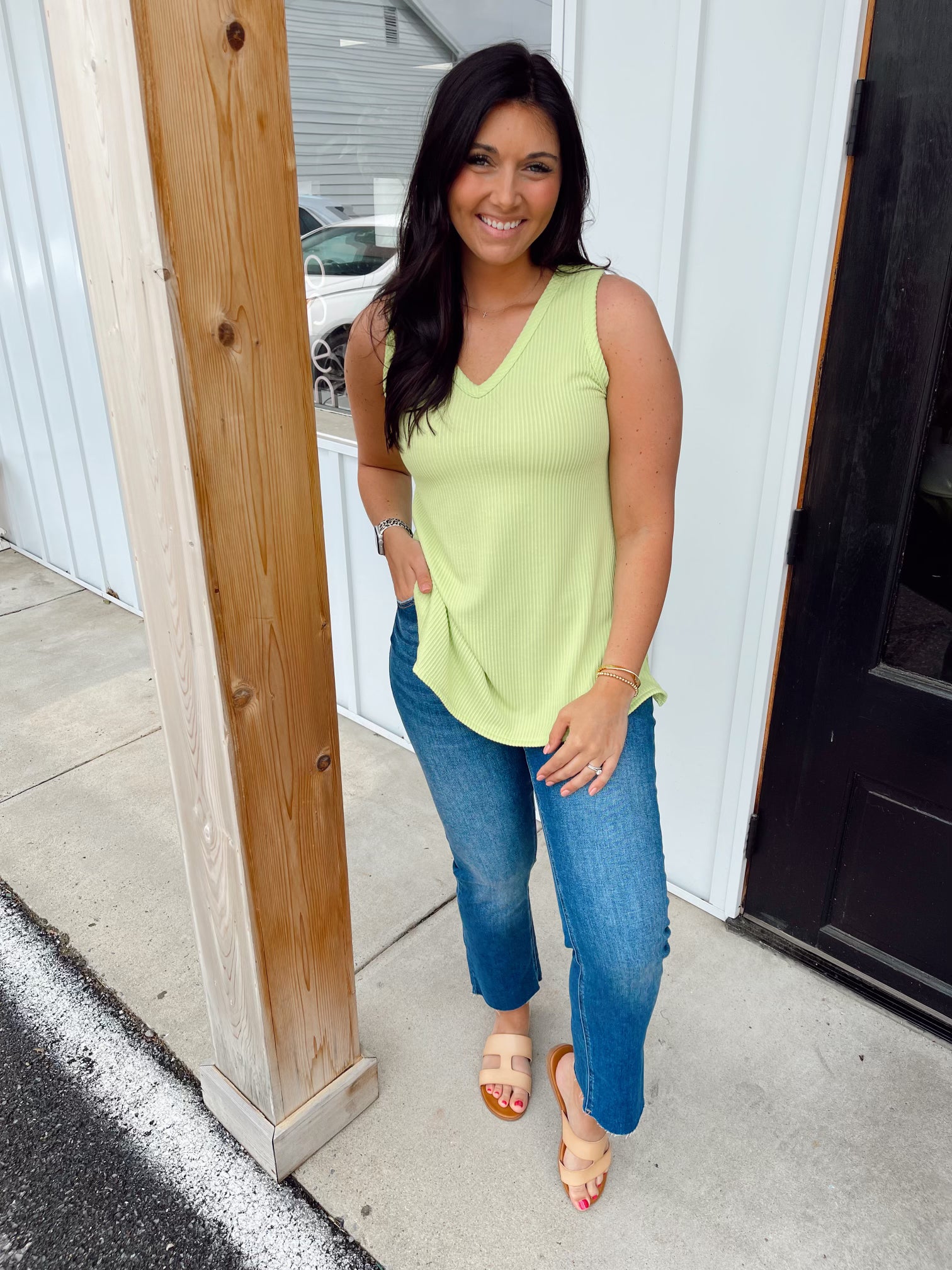 A soft v-neck and flared cut shape this essential tank that's great as both a layering piece or as a stylish top. With a side slit and ribbed fabric, this tank gives drape and movement, and with its flexible material, it will fit to your figure just right.