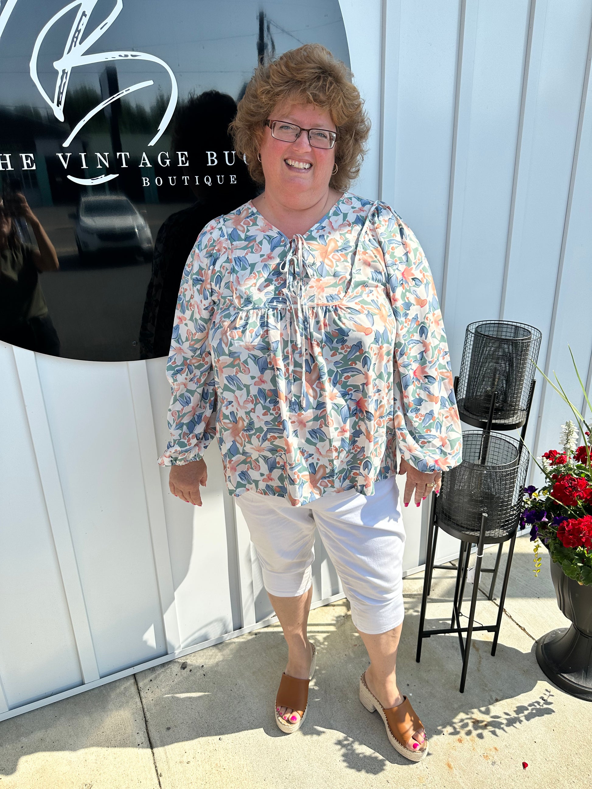 Floral Tie-Neck Long Balloon Sleeve Blouse