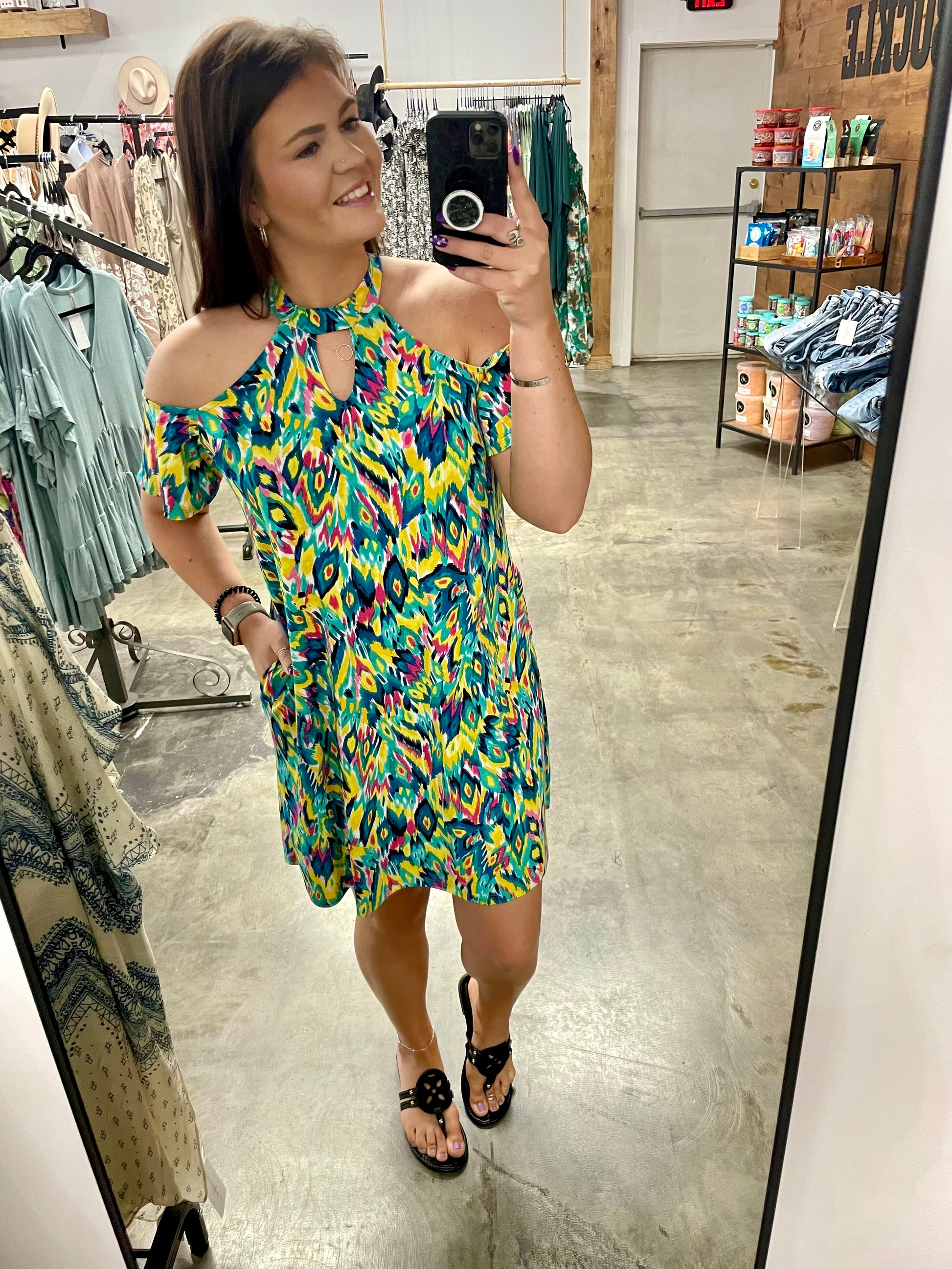 Take a trip to paradise in this vibrant printed dress! The cold-shoulder cutout adds a unique touch, while the halter neck gives it that summery feel. Pair with comfy sandals for a vacation-friendly look, or dress it up with heels.